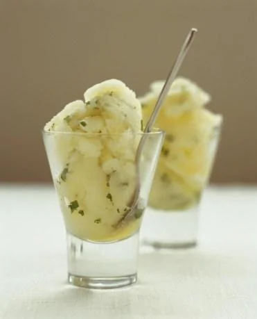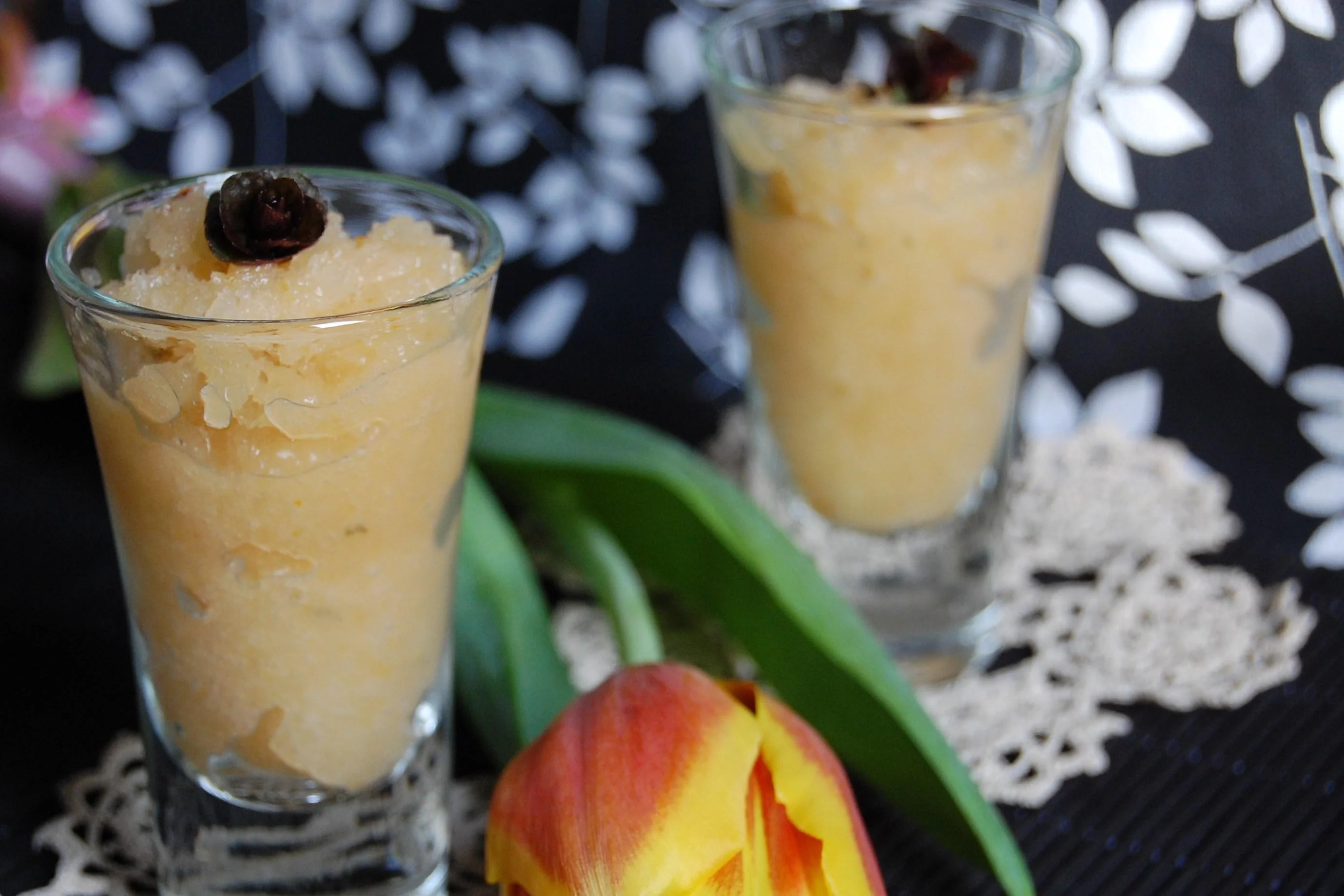ШАГ 3 Положить охлажденные яблоки с сиропом в блендер, выжать сок одного лимона и взбить. Заморозить на 1 час.