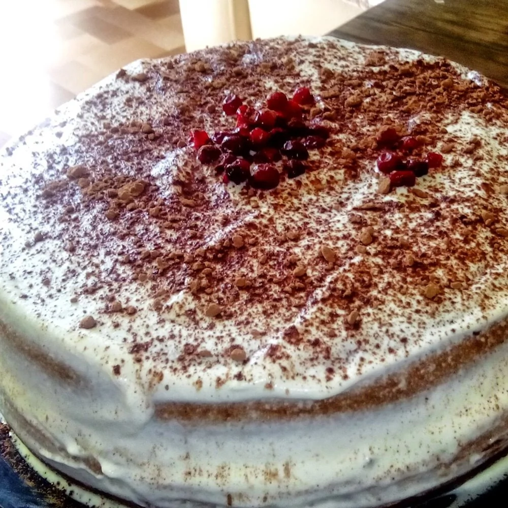ШАГ 6 Положить сверху корж, промазать остатками сливок. Присыпать какао и украсить любыми ягодами.