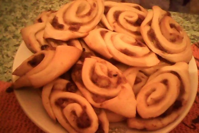 ШАГ 2 Раскатать тесто толщиной 3 миллиметра и смазать остатками масла, посыпать сахаром и ягодами. Если ягод нет, то возьмите густое ягодное варенье. Хотя вы можете выбрать любую начинку на свой вкус. Теперь свернуть тесто в рулет и порезать наискосок на кусочки толщиной в 1 см.