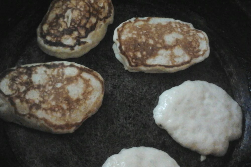 ШАГ 4 После того, как тесто будет готово, начинаем выпекать оладьи. Наливаем на сковороду немного растительного масла и выкладываем тесто ложкой. Если тесто сделано правильно, оно должно наливаться на сковороду как пенка. Когда оладушек пропечется, поддеваем его лопаткой и аккуратно переворачиваем на другую сторону.