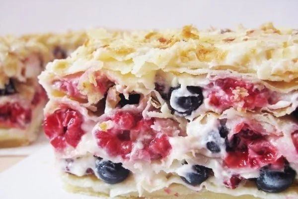 ШАГ 2 Слоенное тесто делим на две части, если в упаковке два пласта соответственно не нужно, раскатываем его немного и в духовку на 180 градусов, тесто должно подняться и стать золотистым, выкладываем и тоже самое со вторым пластом, разрезаем тесто поперек, получается 4 пласта, смазываем каждый пласт сметаной и посыпаем ягодами и складываем торт, последний не нужно.