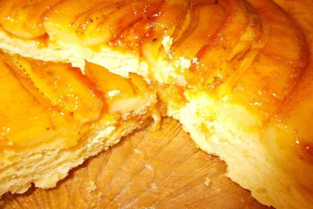 ШАГ 2 Теперь можно начать делать карамель. Топим 50 г сливочного масла (маргарина) в форме (желательно в той же, в которой будете печь пирог). Добавляем 50 г сахара и держим на огне до образования жидкой карамели. Огонь должен быть большим, чтобы не образовывались сахарные комочки. Бананы очищаем и режим пополам вдоль. Укладываем на карамель сердцевиной вниз.