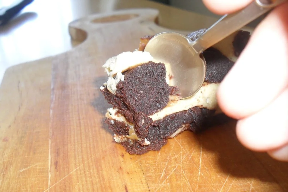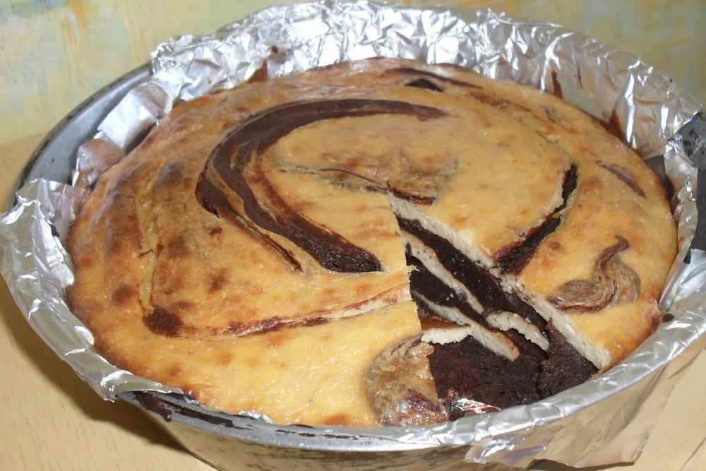 ШАГ 7 Смазываем форму сливочным маслом. Сначала тонким слоем выкладываем шоколадную массу, можно оставить несколько прогалин. Сверху неравномерно вкладываем творожно-банановую массу. Осторожно спичкой сделаем несколько красивых волн, смешивая слои. Далее выкладываем слои по очереди. Выпекаем в духовке 30 минут при 175 градусах.