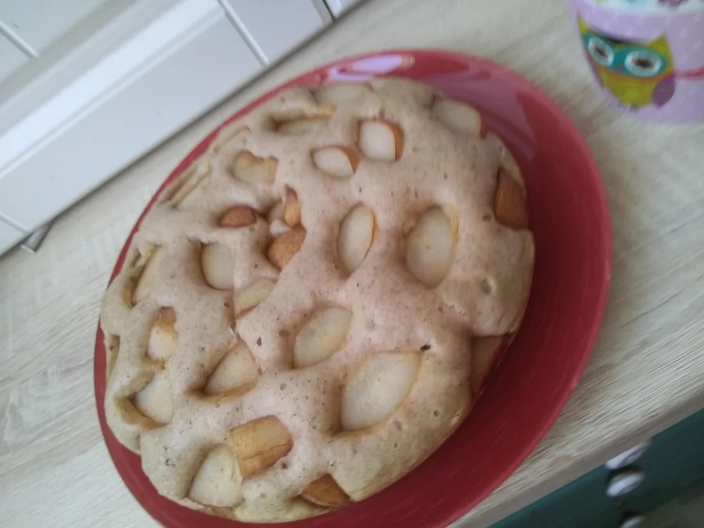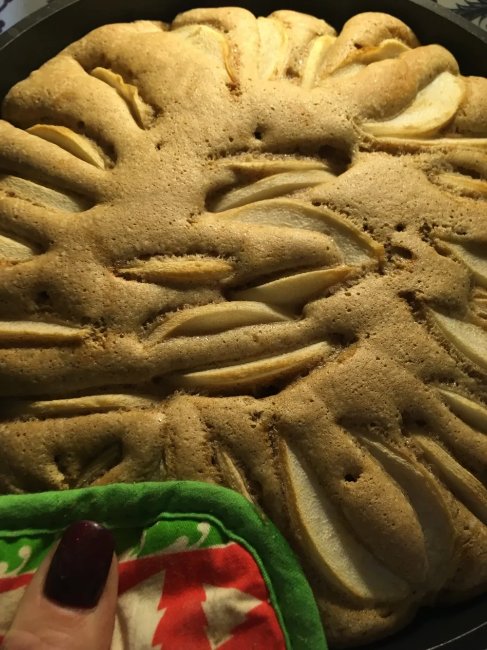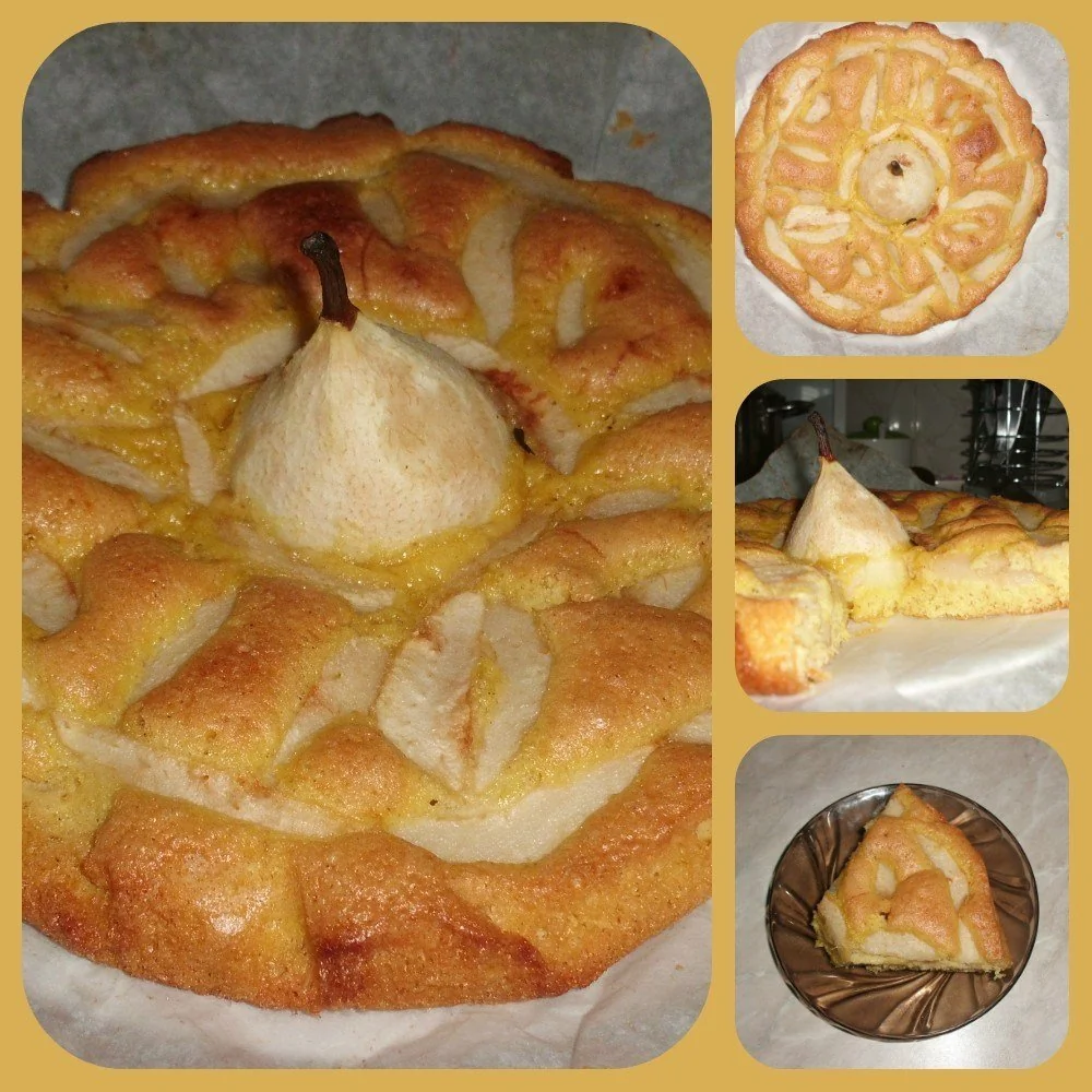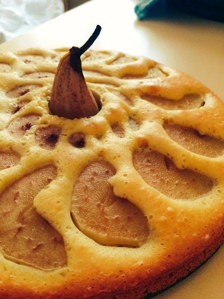 ШАГ 5 Вылить тесто в форму, смазанную маслом (кроме стенок). В центр поставить грушу, выложить дольки по кругу.
