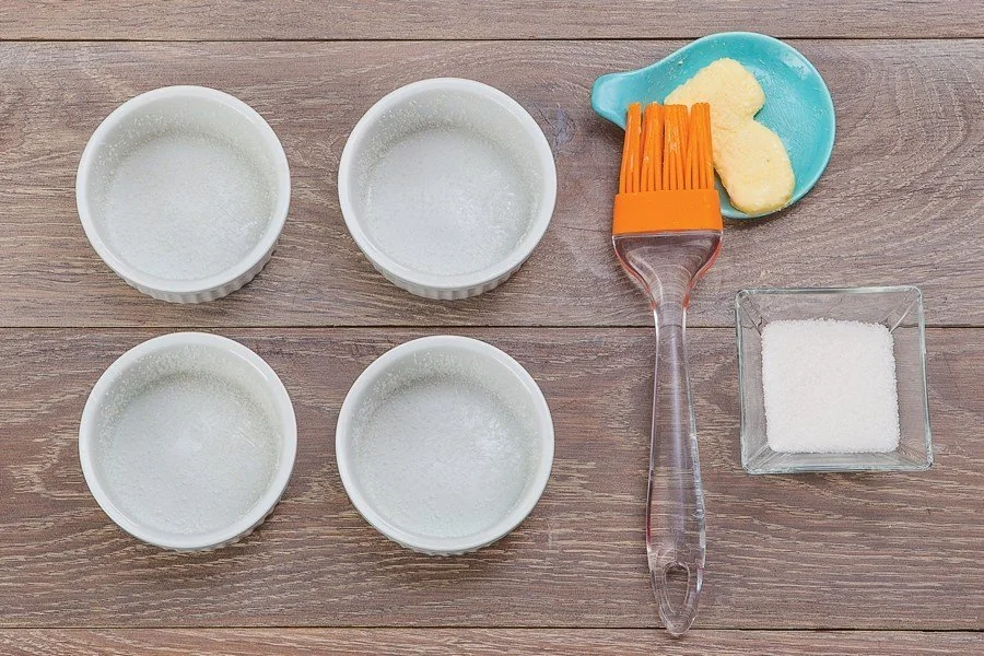 ШАГ 1 Небольшие керамические формочки смажьте подтаявшим сливочным маслом снизу вверх (от дна к краю, края не вытирайте), обсыпьте сахаром дно и бока и отправьте в холодильник на 5 минут.