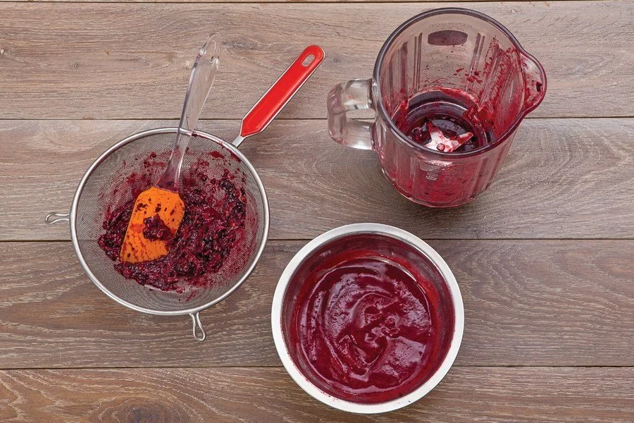 ШАГ 2 Ягоды взбейте в однородную массу в блендере, затем протрите через сито.