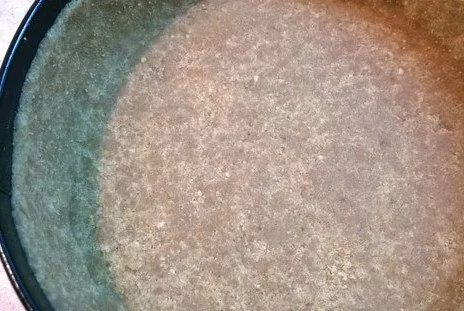 ШАГ 2 Разъемную форму 21 см хорошенько смазать сливочным маслом, выложить в нее тесто, с бортиком. Утрамбовать. Отправляем в разогретую до 160 градусов духовку на 10 минут, в зависимости от вашей духовки. Корж должен хорошо подрумяниться.