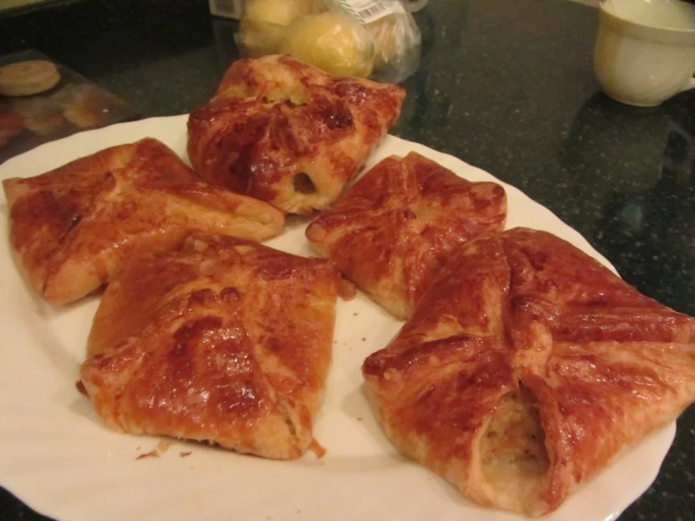 ШАГ 5 На середину выложить большую горку начинки. Поднять два края, слепить их между собой. Поднять третий край, слепить. Также хорошо придавить уголки. Перевернуть, получается остроконечный треугольник. Затем тоже самое повторить для всего остального теста. Полученные заготовки выложить на противень, застеленный пекарской бумагой.