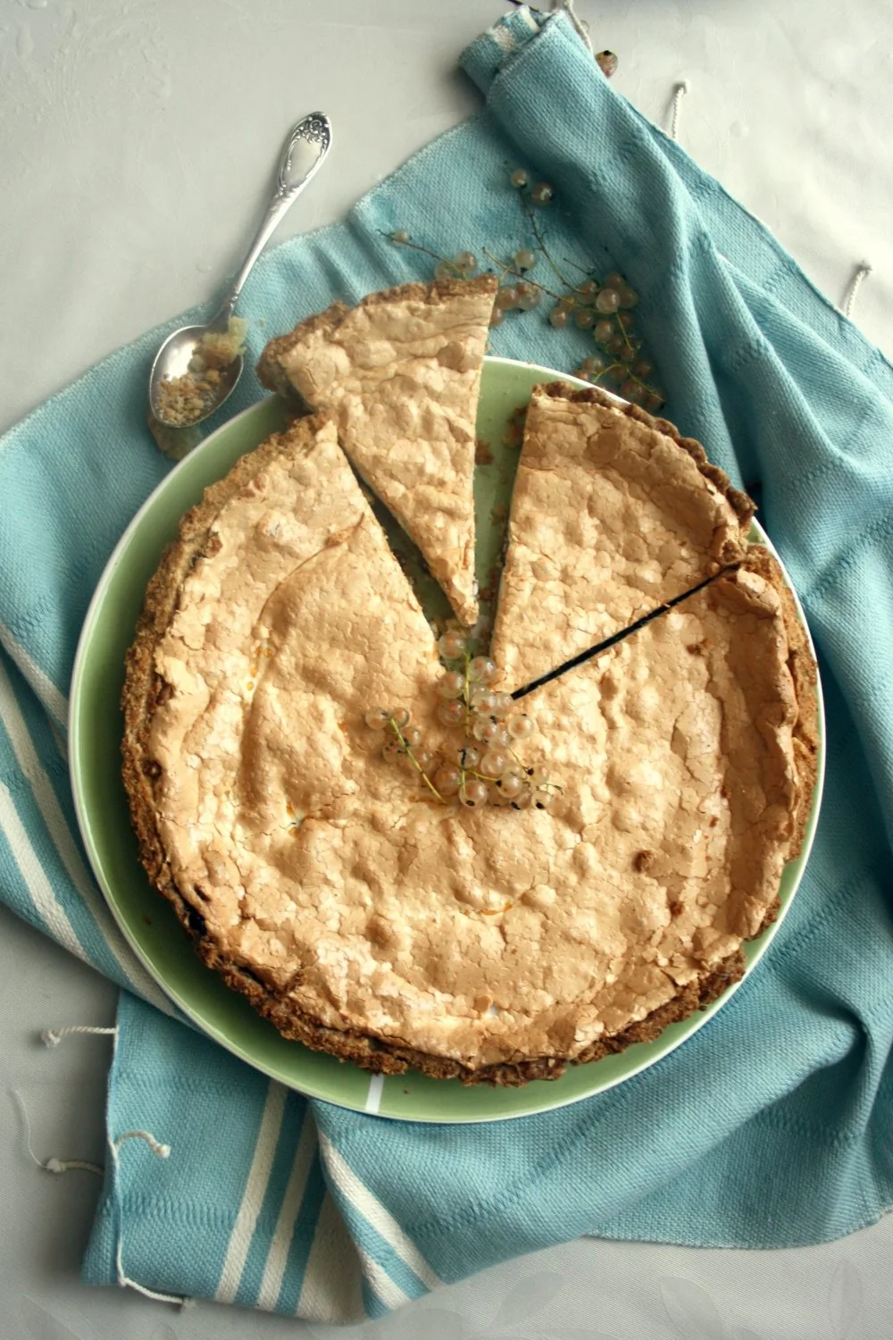 ШАГ 4 Взбить белки с сахарной пудрой до жестких пиков. Достать пирог из духовки, выложить белки и запекать еще 20–25 минут при 160 градусах. Готовый пирог полностью остудить.