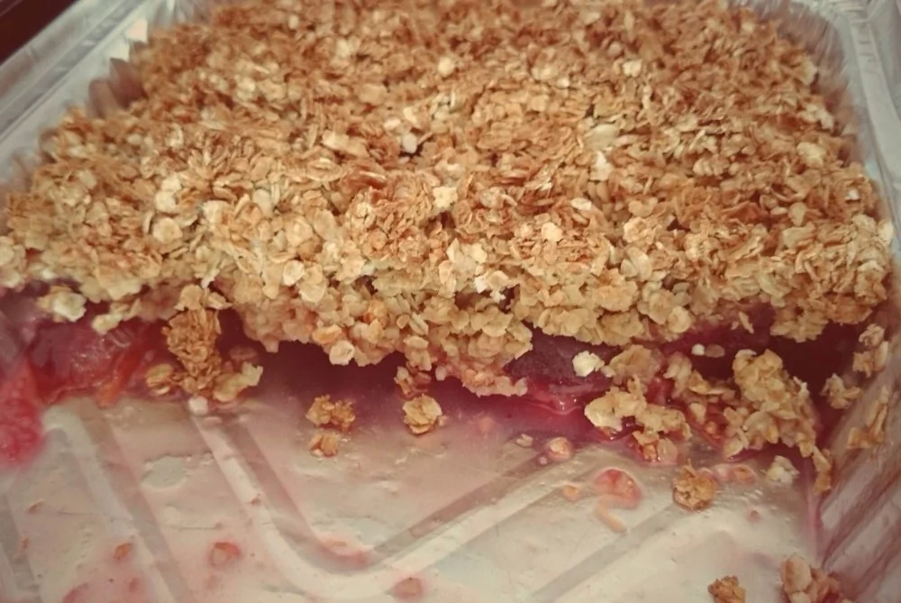 ШАГ 4 В форму выложить сливы и засыпать сверху овсяной крошкой. Выпекать в духовке при температуре 180 градусов 30–40 минут (должна получиться корочка).