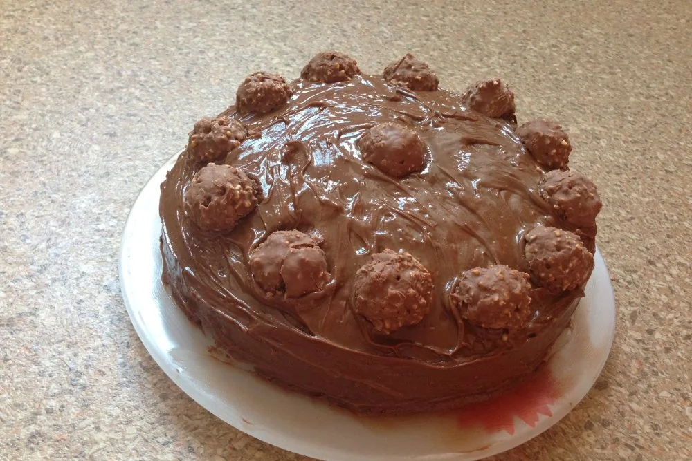 ШАГ 9 Оставшимся кремом смазываем верх и бока торта. Посыпаем бока вафельной крошкой или измельченными орехами. Ставим в холодильник на 5–10 минут, чтобы крем немного схватился. Затем сухим горячим ножом выравниваем поверхность. Конфеты Ferrero rocher разрезаем пополам и украшаем ими торт. Хорошо его охлаждаем.