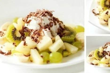 ШАГ 3 Все фрукты выложить на тарелку, сверху выложить шарик пломбира, посыпать шоколадной крошкой.