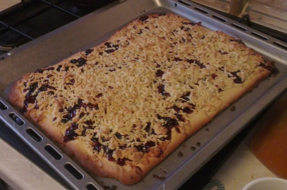 ШАГ 7 Сверху на корж намазать любое варенье, которое нравится. Лучше всего подходит сливовое (кисловатый вкус хорошо сочетается с сахарным тестом), но можно и любое другое. Варенье нужно намазать немного отступив от края, чтобы оно не вытекло на противень.