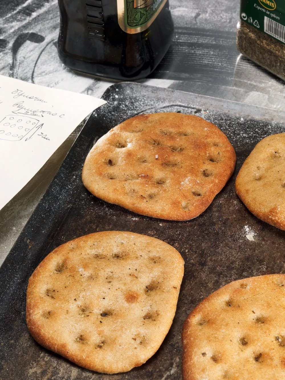ШАГ 4 Сформовать маленькие лепешки. Сложить лепешки на противень, смазать оливковым маслом, продавить пальцами, чтобы остались небольшие вмятины, посыпать орегано, накрыть пленкой.