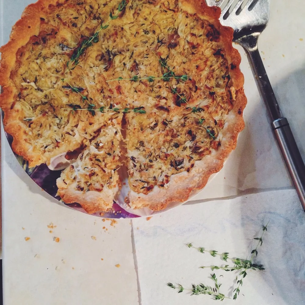 Оливковое масло Лук репчатый Чеснок Филе анчоуса Свежий тимьян Сметана 20%-ная Пшеничная мука Сливочное масло Яйцо куриное Сухие дрожжи Выпечка и десерты Европейская кухня Торты