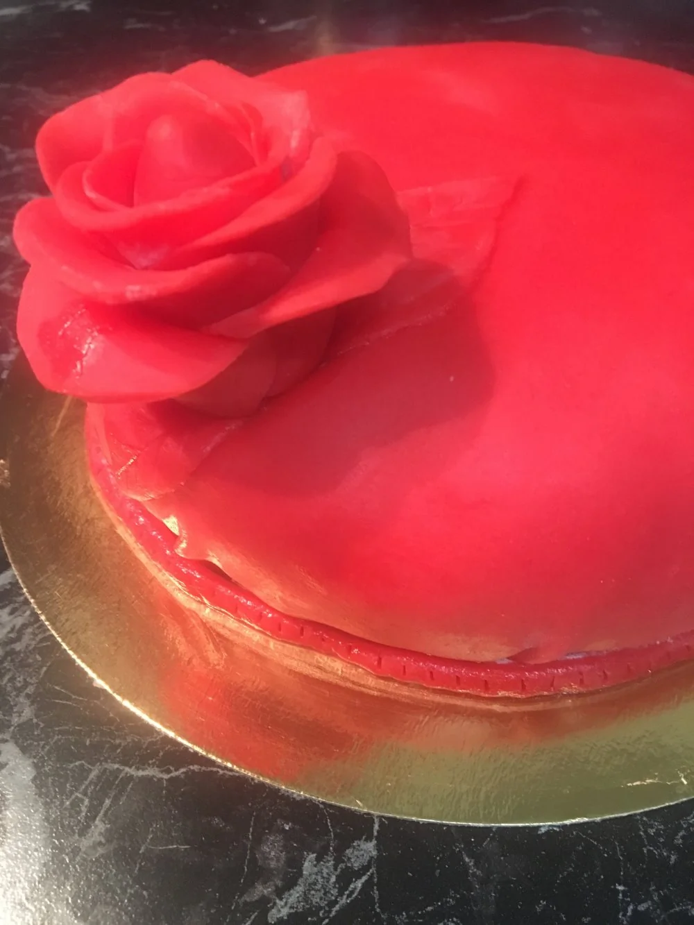 ШАГ 6 Масло комнатной температуры взбить с оставшейся сахарной пудрой и покрыть поверхность последнего коржа, а также бока торта. Круглым листом марципана (классический цвет торта — зеленый) аккуратно покрыть торт, сделав по бокам складочки. Украсить по вкусу.