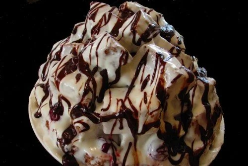 ШАГ 5 Выложить вишни, ананасы и орехи. Каждый кусочек теста обмакивать в сметанный крем и выкладывать на торт. Затем опять добавить вишню, орехи, ананасы и кусочки теста - сложить так тортик. Залить торт сметанным кремом. Растопить шоколад на водяной бане и нанести сверху на торт рисунок.