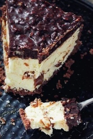 ШАГ 6 На охлажденную основу вылейте половину молочного крема, затем выложите слой карамели. Сверху выложите остальной молочный крем. Поставьте форму в холодильник, чтобы начинка застыла. Затем нанесите шоколадно-ореховую глазурь и отправьте еще на 2–3 часа готовый торт в холодильник.