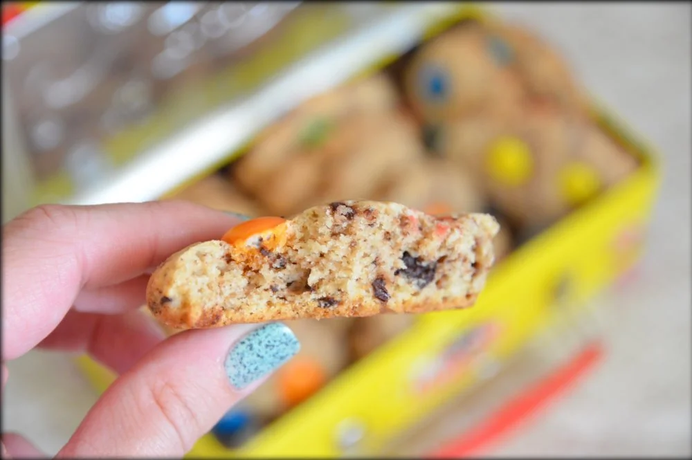 ШАГ 3 Всыпать сухие ингредиенты в жидкие и слегка помешать (тесто на этом этапе не должно быть однородным). Добавить M&M’s и порубленный на кусочки тёмный шоколад и вмешать их при помощи мягкой лопаточки (аккуратно, стараясь не повредить конфетки). При желании конфетки и шоколад можно не добавлять в само тесто, а украсить ими печенье только сверху.
