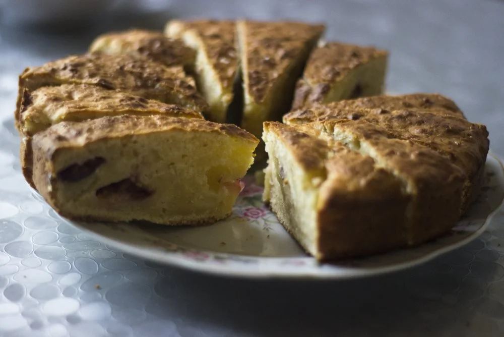 ШАГ 6 Больше половины теста вылить на смазанный маслом подсолнечным противень или в посуду для запекания и добавить начинку. В идеале нужно по рецепту моей мамы добавлять вишню без косточек, вкус будет кисло-сладким, но т.к у меня не было вишни, я добавила то, что есть в холодильнике: немного кусочков груши, яблок и сливы. Чем больше фруктов, тем сильнее они будут давать сок внутри пирога(!). В разрезе этот пирог красиво смотрится с контрастными фруктами (например, слива, ежевика, смородина, вишня, т.к тесто само белое внутри).