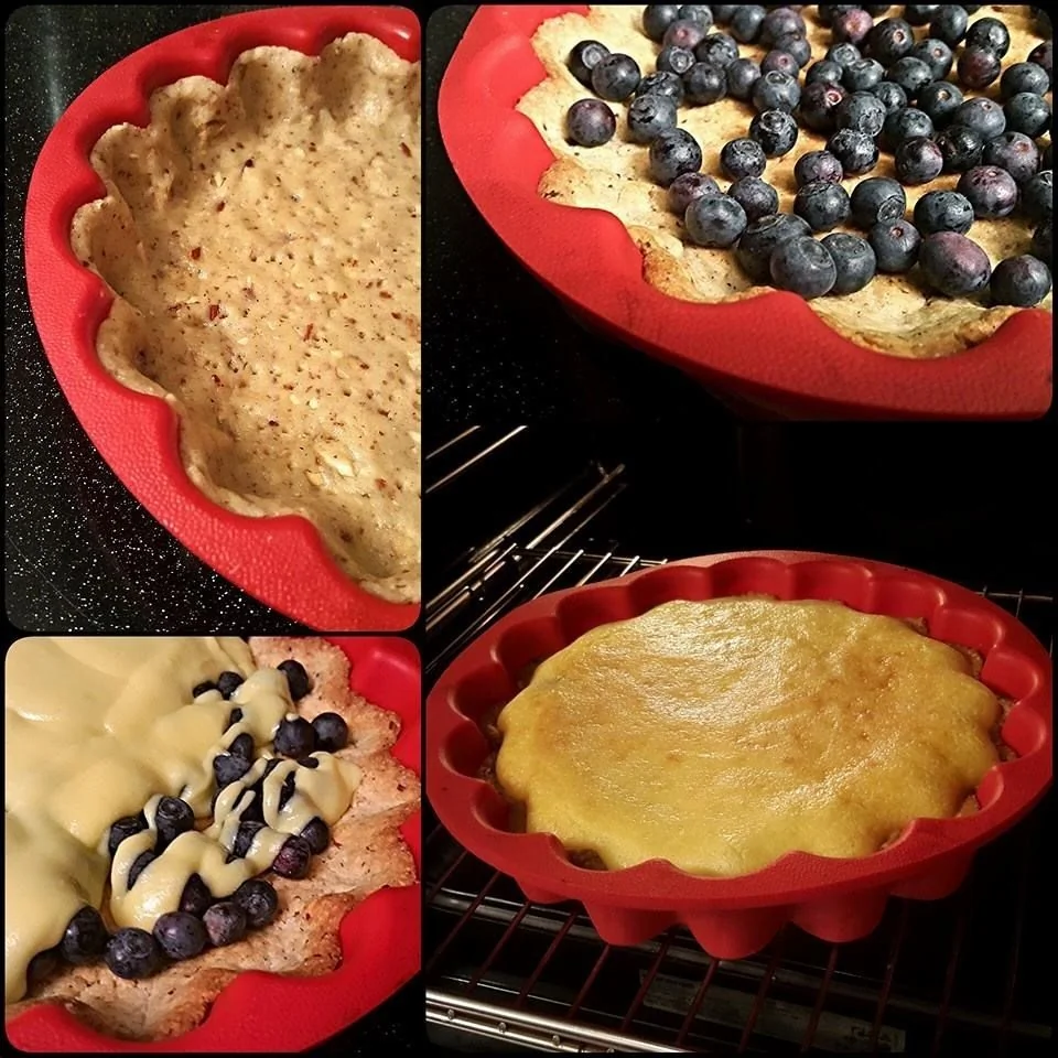 ШАГ 4 Готовый корж вынуть из духовки, разложить по его горячей поверхности голубику.