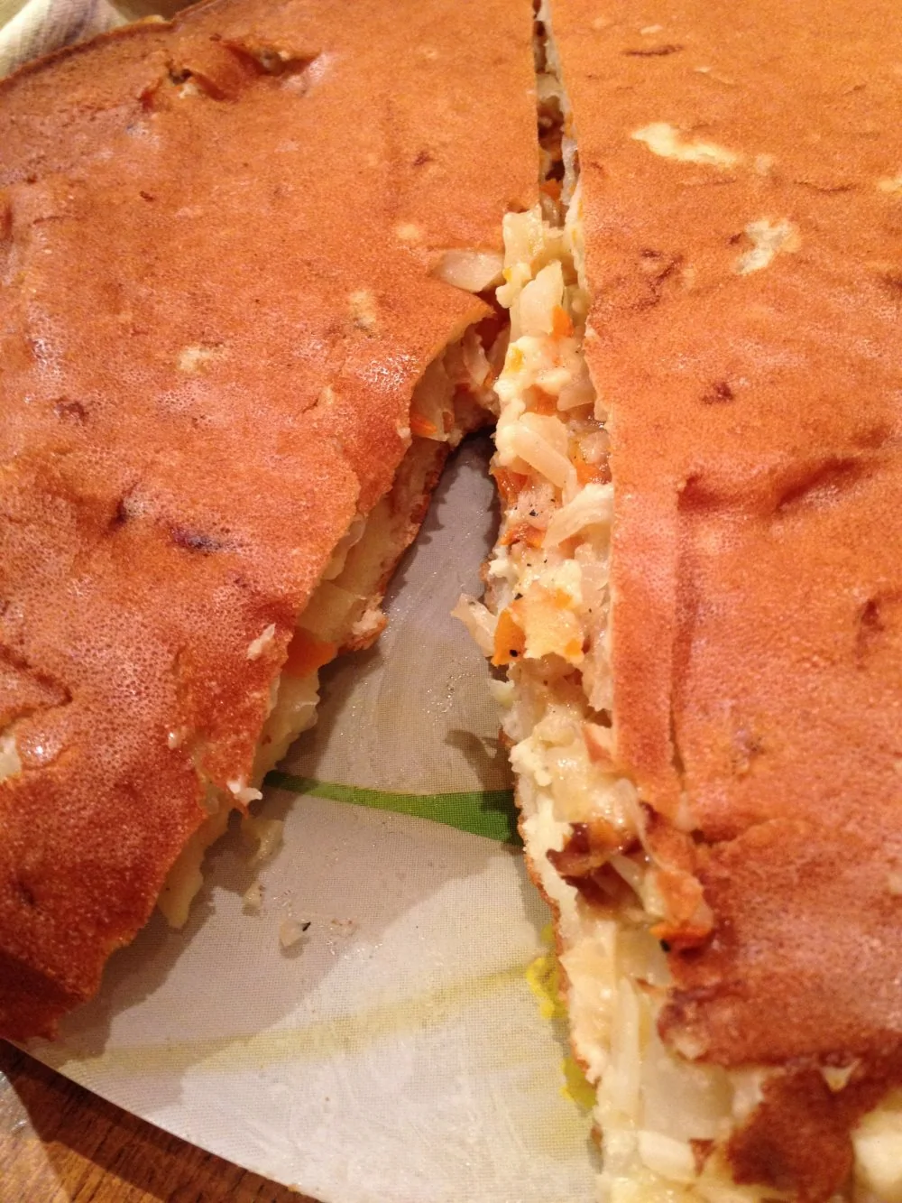 ШАГ 3 В смазанную форму вылить чуть меньше половины теста, выложить капусту. Залить остатками теста. Выпекать в духовке 40 минут, предварительно разогрев до 180 градусов.