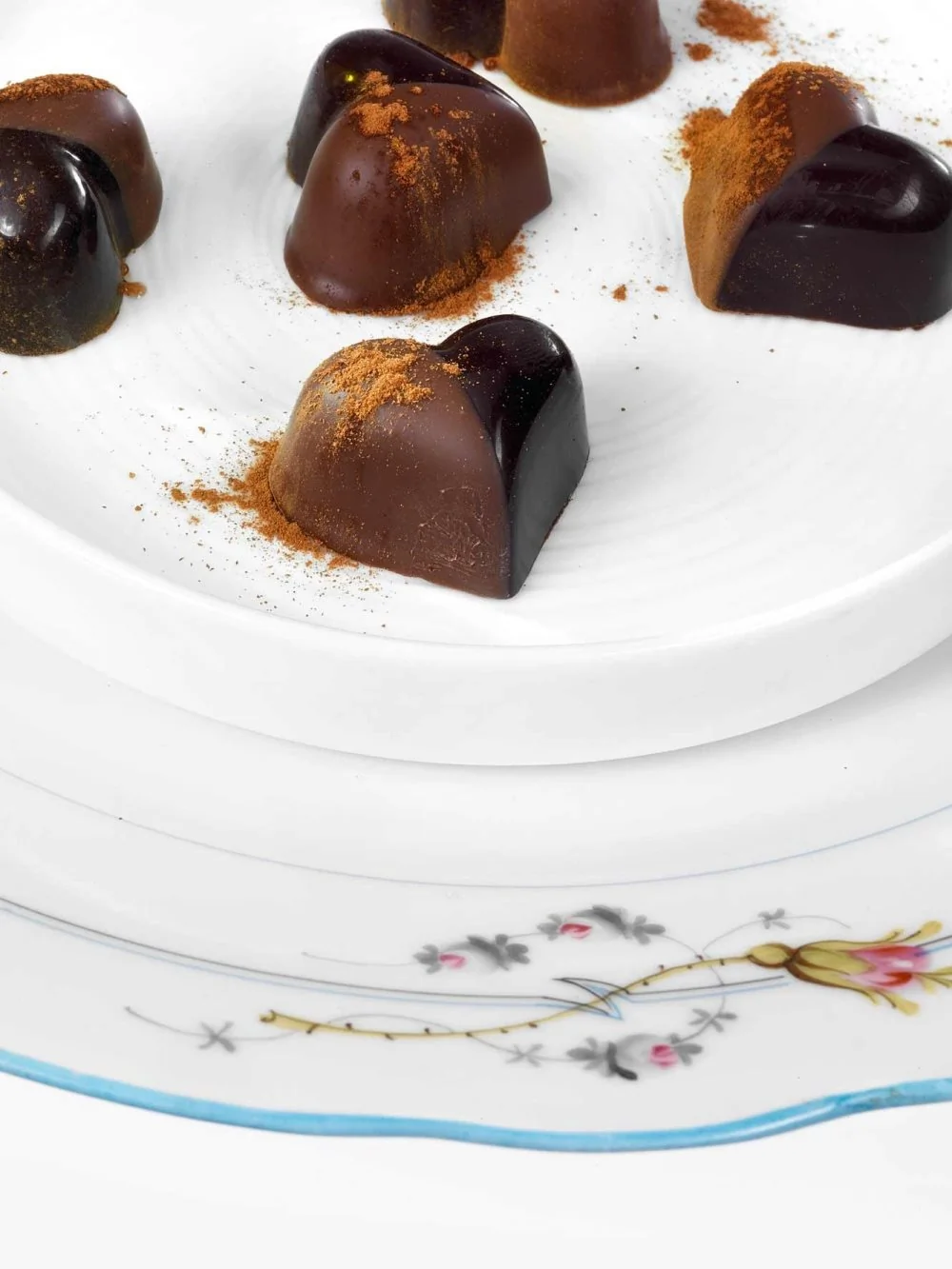 ШАГ 2 Темперировать горький шоколад: разогреть его до температуры 45 градусов, остудить до 33. Заполнить им доверху формы (можно использовать любые, не только сердечки), слить шоколад, остудить в холодильнике в течение 10 минут. Заполнить формы начинкой, «закрыть» их шоколадом, остатки снять кондитерским скребком или широким ножом. Дать остыть в холодильнике в течение 10 минут.