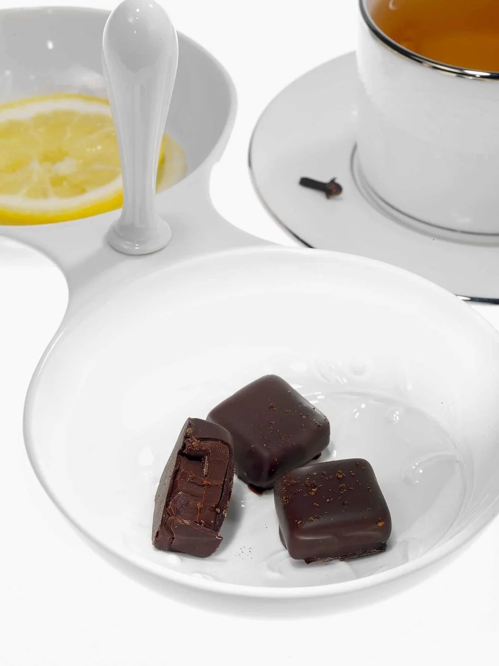 в микроволновке или на водяной бане разогреть его до 45 градусов, тут же снять и поставить миску на лед или в холодную воду, остудить до 33 градусов. Окунуть каждую конфету в шоколад, тут же чуть-чуть присыпать гвоздикой, дать высохнуть и подавать.
