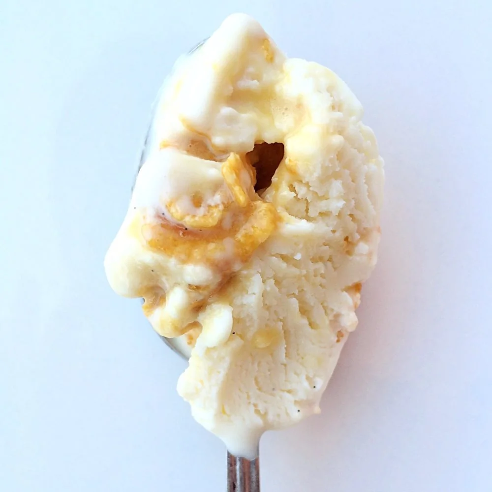 Заморозьте во фризере для мороженого в соответствии с инструкцией, добавив кусочки кукурузного грильяжа в последние пару минут замораживания. Переложите мороженое в контейнер и уберите в морозилку минимум на 4 часа до застывания.