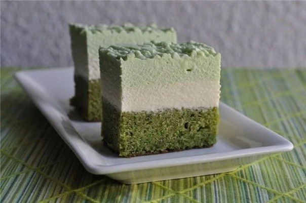 ШАГ 6 Приготовьте мусс с зеленым чаем. Выложите его на слой мусса с жасмином, разровняйте, можете придать рисунок вилкой.