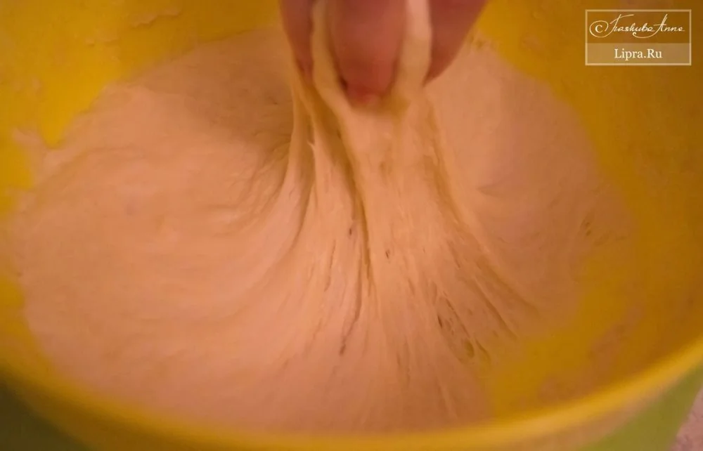 ШАГ 7 Когда тесто поднялось, осаживаем его, тщательно замешивая, пока тесто не перестанет липнуть к рукам.
