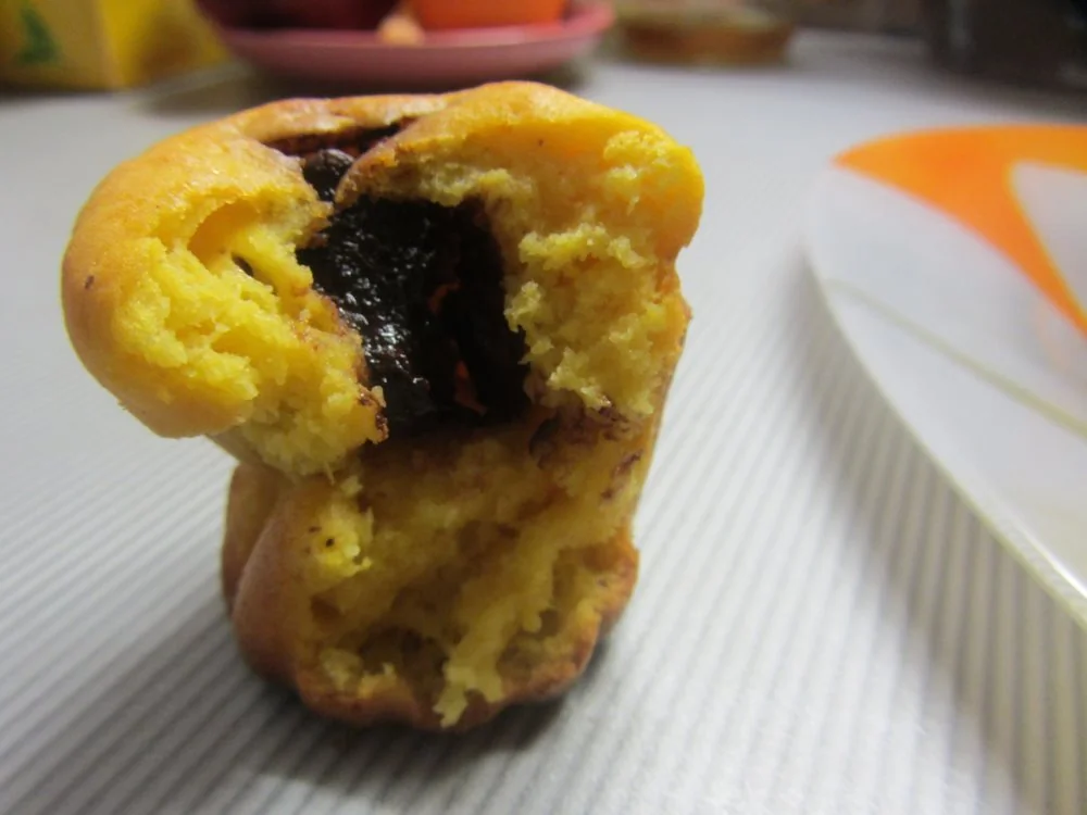 ШАГ 2 Выложить в формочке по столовой ложке теста (примерно), положить кусочек любимого шоколада, накрыть еще ложкой теста.
