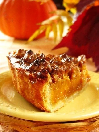 ШАГ 8 Духовку разогрейте до 230 градусов. Форму диаметром 23–24 см смажьте или выстелите бумагой для выпечки. Тесто раскатайте по диаметру формы. Выложите основу с бортиками. Немного взбейте тыквенную начинку и вылейте ее в основу. Сверху равномерно распределите орехи. На орехи вылейте медовую начинку. Поставьте в духовку и выпекайте 10 минут. Затем уменьшите жар до 150 градусов и выпекайте еще минут 50–60.