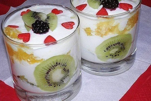 ШАГ 9 Последним в десерте творожном должен быть слой с творожной массой. Украсить оставшимися кружочками разных фруктов.