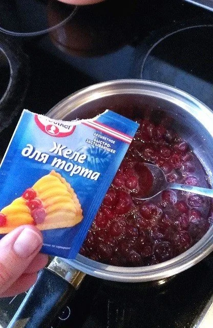 ШАГ 4 Поставить духовку греться на 180–200 градусов. Вишню с оставшимся сахаром (по вкусу) высыпать в ковшик, поставить на сильный огонь. Она начнёт давать сок и закипать — убавляем чуть-чуть и не забываем помешивать. Пусть покипит минуты 3; всыпаем порошок для желе (или крахмал) и перемешиваем. Еще пару минут на плите.