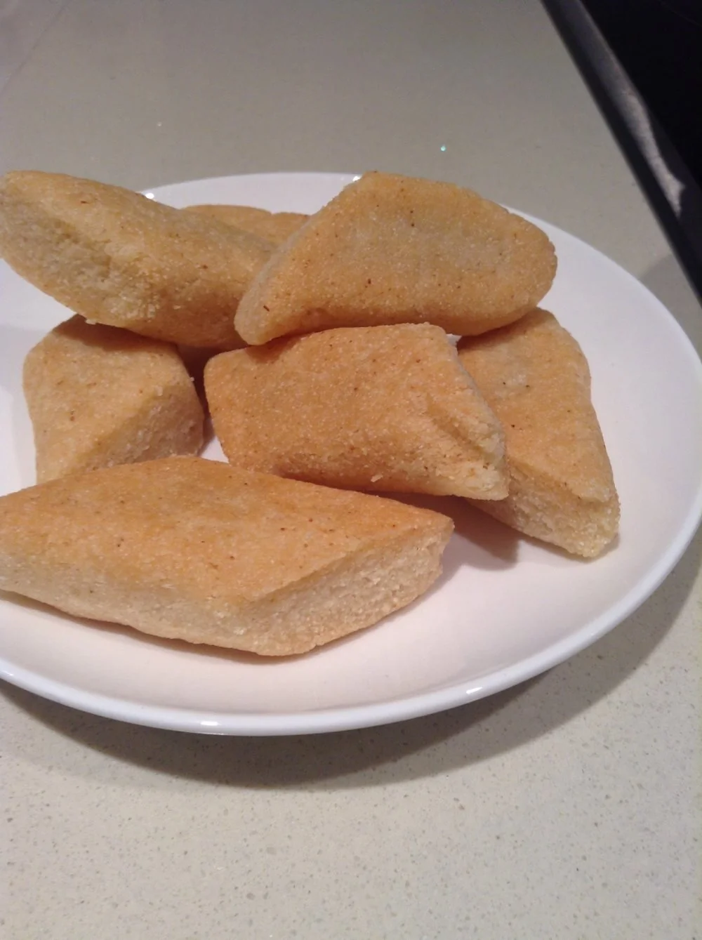 ШАГ 7 Когда масло разогреется, выложить кусочки печенья и жарить с одной стороны до слегка золотистого цвета и перевернуть. Когда печенье затвердеет и станет золотистого цвета с обеих сторон, выложить на салфетку, дать стечь маслу и остудить.