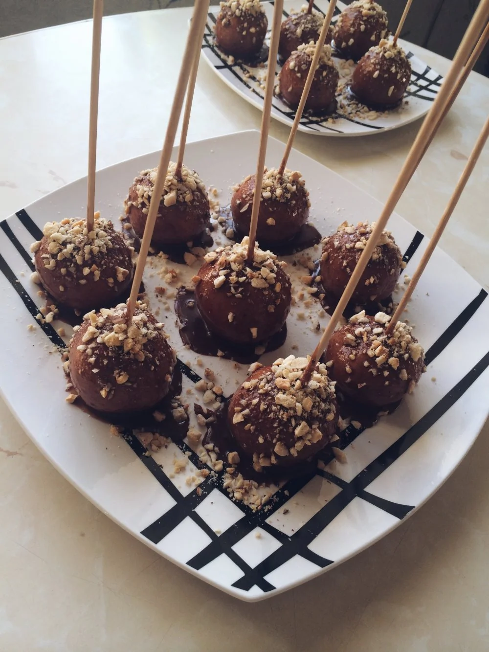 ШАГ 7 Достать шарики из морозилки и по очереди окунуть все палочки для кейк попсов в шоколад и вставить их в в центр шариков. Убрать шарики в холодильник на 15 минут.