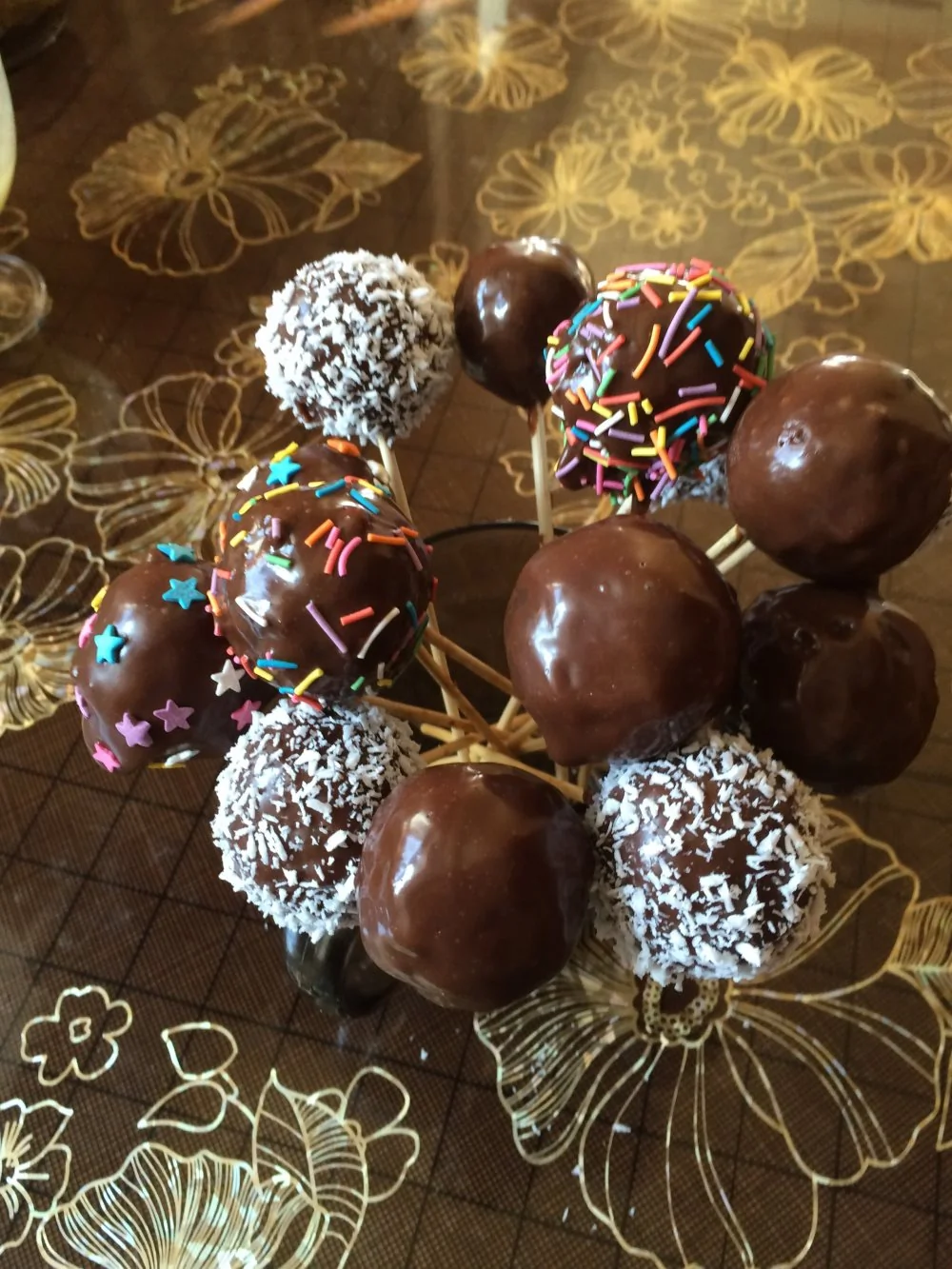 ШАГ 8 Покрываем кейк попсы шоколадом. Для этого взять шарик за палочку, строго вертикально окунуть его в шоколад и резко вытащить. Подержать на весу и дать сечь лишнему шоколаду. Поставить на тарелку и украсить сверху посыпками.