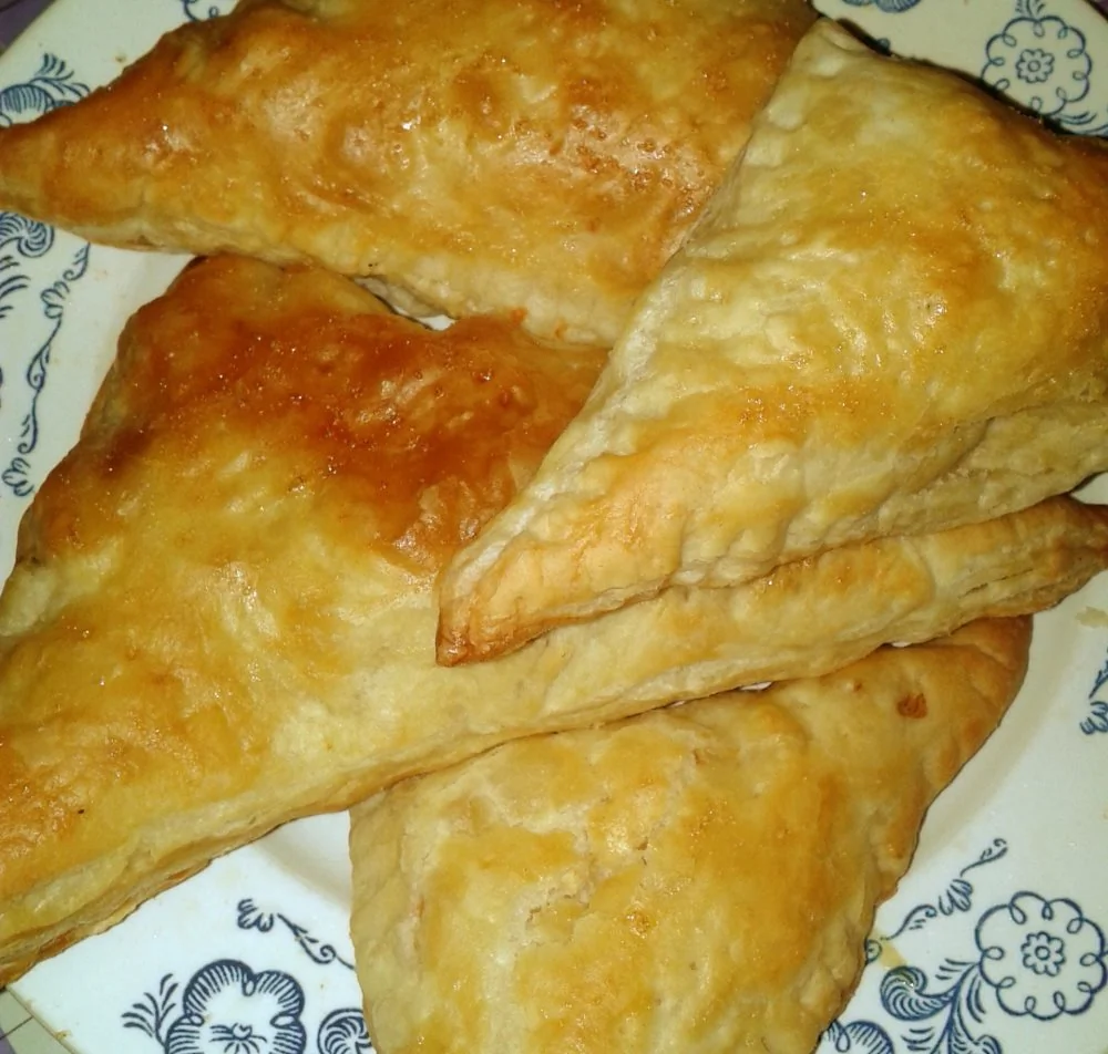 ШАГ 4 Пока начинка остывает, раскатываем и режем тесто. Можно прямоугольниками (у меня треугольники) Зависит от того какой формы слойки вы хотите.