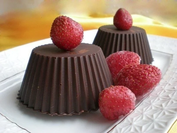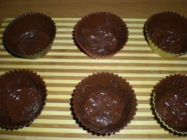 И нанести кисточкой слой шоколада на «донышко». Через некоторое время аккуратно извлеките десерт из формочек. Я просто отогнула края и легко вытащила шоколадные корзинки.