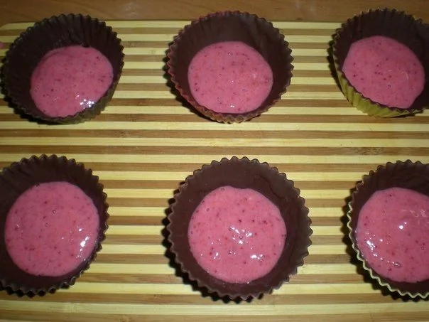 ШАГ 3 В формочки залить клубничный наполнитель и снова отправить формы в холодильник.