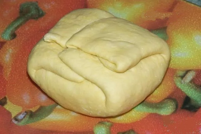 ШАГ 3 Теперь подготовим тесто 2. В миску высыпаем муку. Муки лучше взять сразу немного меньше, потому что тесто должно получится достаточно мягким, не крутым, а потом в процессе вымешивания добавлять. Добавляем к муке уксус (или лимонный сок), соль. В стакан вбиваем яйцо. Доливаем в него воды, чтобы получилось 2/3 стакана жидкости. Обычно я беру кипяченую воду комнатной температуры, она всегда стоит у меня на кухне, поэтому температура воды не принципиальна! Взбиваем слегка ложкой, чтобы яйцо смешалось с водой, и вливаем в муку. Хорошо вымешиваем тесто, сначала ложкой, а затем руками на присыпанной мукой поверхности. По необходимости добавляем муку. Это тесто ни в коем случае не должно быть крутым, иначе в итоге получится жесткое слоеное тесто. Теперь тесто 2 раскатываем в небольшой прямоугольник. Не тонко, иначе затем будет прорываться. На него кладем первое тесто ближе к одному краю по середине, таким образом, чтобы можно было завернуть его конвертом. Теперь заворачиваем, сначала накрываем близким краем. Затем заворачиваем по бокам. И наконец — закрываем оставшимся «хвостом». Получаем первое тесто в конверте. Таким образом тесто кладем в тарелку, присыпанную мукой и отправляем в холодильник на 30 минут. Кладем тесто «швом» вниз, чтобы лучше закрепить края. Когда отправляем тесто в холодильник, ничем не накрываем. Иначе образуются капельки, и тесто станет мокрым, что нам совсем не нужно. Через 30 минут достаем тесто из холодильника, кладем на раскатываемую поверхность таким же образом, как оно лежало на тарелке и раскатываем скалкой, не сильно, так, чтобы можно было вновь свернуть конвертом. Сворачиваем и вновь отправляем в холодильник на 30 минут. Через 30 минут достаем тесто. Раскатываем на присыпанной муке поверхности и снова заворачиваем конвертом. Отправляем в холодильник на 30 минут. Теперь наше тесто готово. Можно готовить из него сразу же.