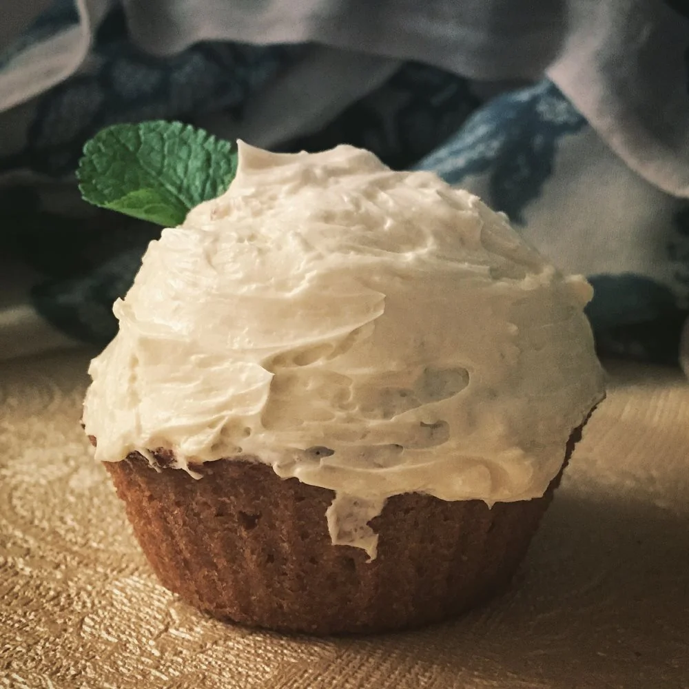 ШАГ 4 Покрываем кремом остывшие капкейки и украшаем листиками мяты.