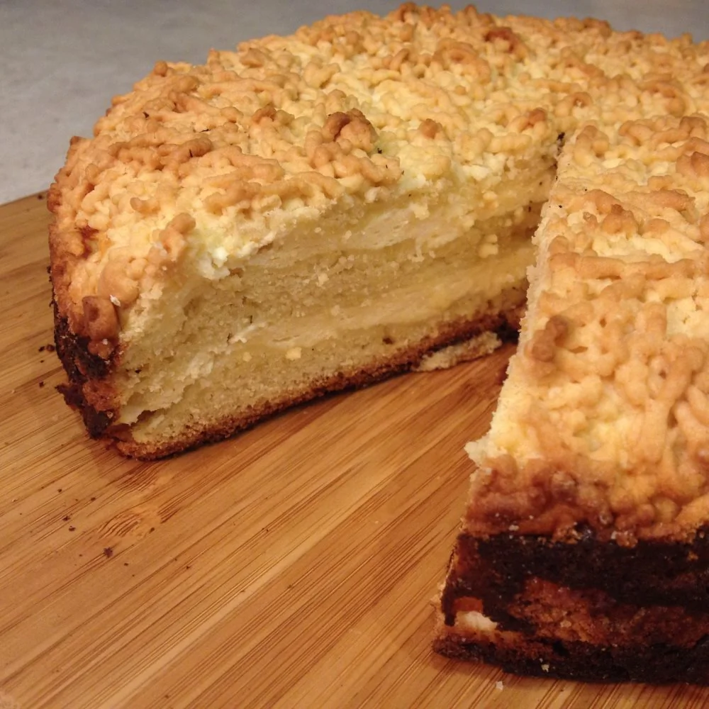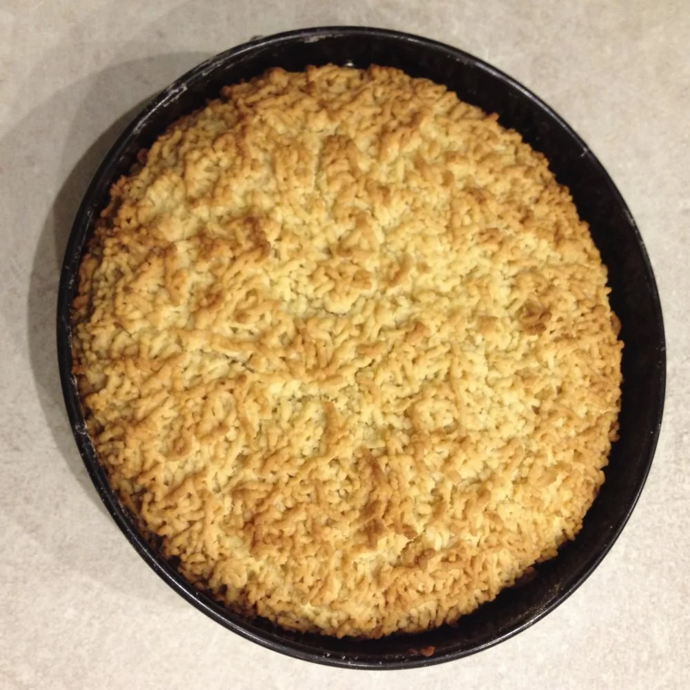 ШАГ 5 Тесто разделить на 3 равных части. Начинку — на 2 части. Одну часть теста выложить в форму с пергаментом, затем слой начинки, снова слой теста и начинки. Третью часть теста смешать с оставшимся 0,5 стаканом муки, и натереть на терке, полностью закрыв слой начинки из творога.