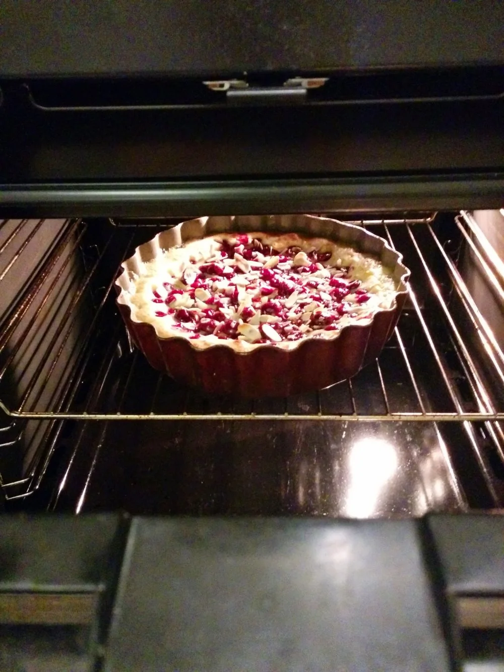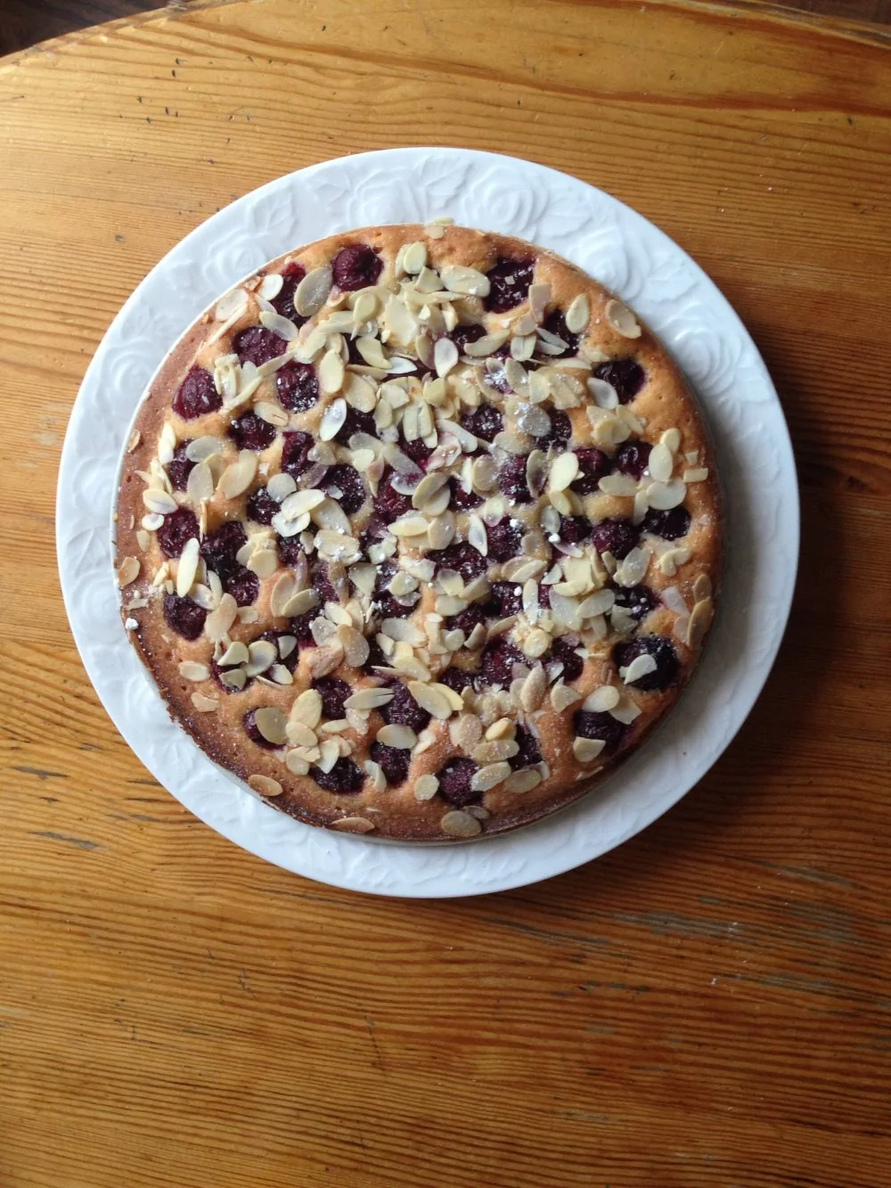 ШАГ 6 Тесто выложить в форму. Сверху добавить вишню и посыпать миндальными лепестками.