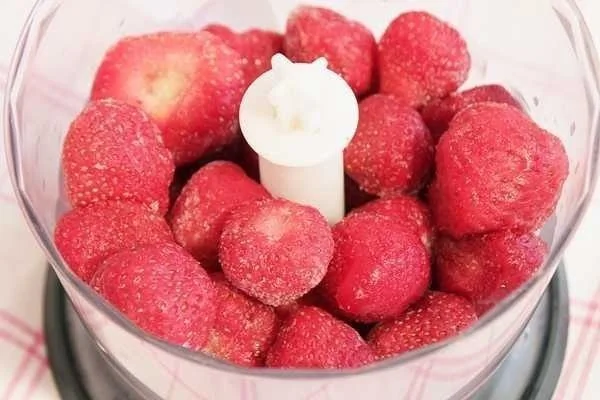 ШАГ 4 Для этого, пока остывает рис, приготовим клубничный соус. Клубнику измельчаем в блендере (можно взять мороженую). Перекладываем в кастрюлю, размешиваем с сахарным песком и ставим на небольшой огонь. Сахар лучше брать белый, т.к. коричневый добавляет свой цветовой оттенок соусу.