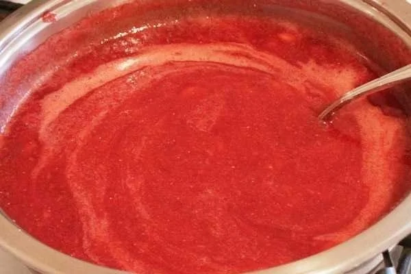 ШАГ 5 В отдельной чашке смешайте две чайные ложки (без верха) крахмала с парой столовых ложек воды. Когда клубничное пюре начнёт закипать (не забывайте помешивать время от времени) перемешайте ещё раз крахмал с водой, т.к. он оседает на дно, и влейте тонкой струйкой в горячий соус. Опять же постоянно помешивая, чтобы крахмал не образовал комков.