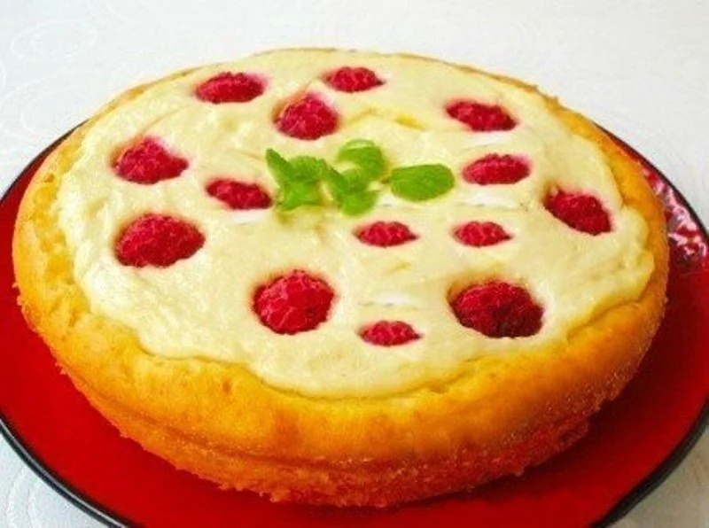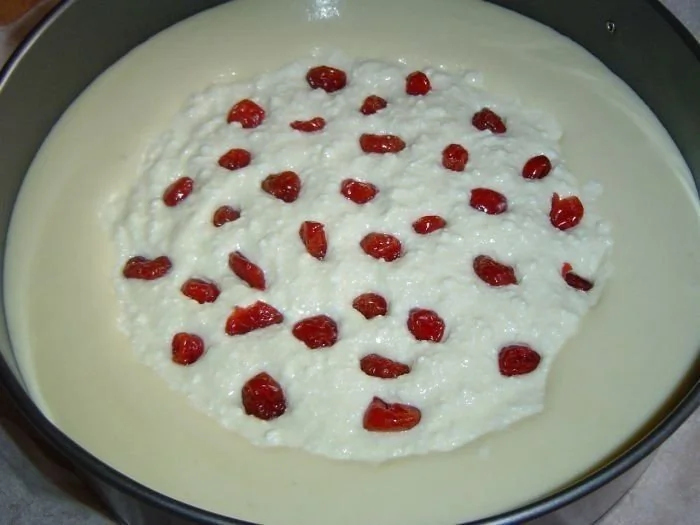 ШАГ 5 Сверху на творожную начинку кладем ягоды вишни (можно использовать любые ягоды) и отправляем в холодную духовку, затем выставляем температуру 180 градусов и выпекаем пирог 35-40 минут.