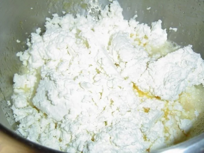 ШАГ 3 Теперь приступаем к приготовлению начинки. Творог, манную крупу, 3 яйца и 0,5 стакана сахара соединяем и тщательно перемешиваем (можно с помощью блендера).