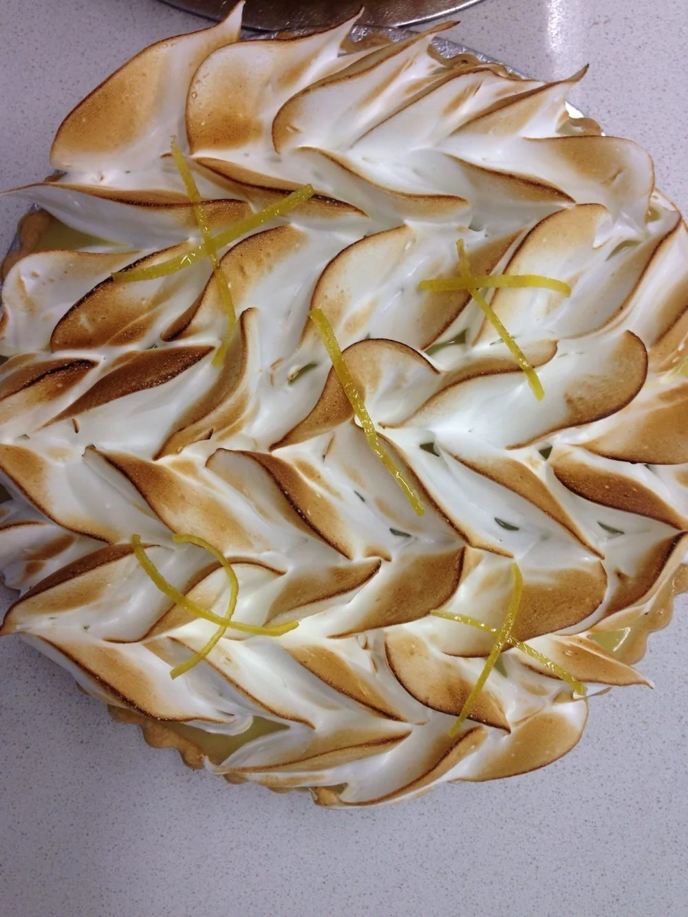 ШАГ 14 Сборка тарта: в песочную основу выкладываем охлажденный лимонный курд. Сверху через кондитерский мешок (или просто ложкой) красиво выкладываем меренгу. Придаем ей цвет кулинарной горелкой или в духовке на максимальной температуре пару минут.